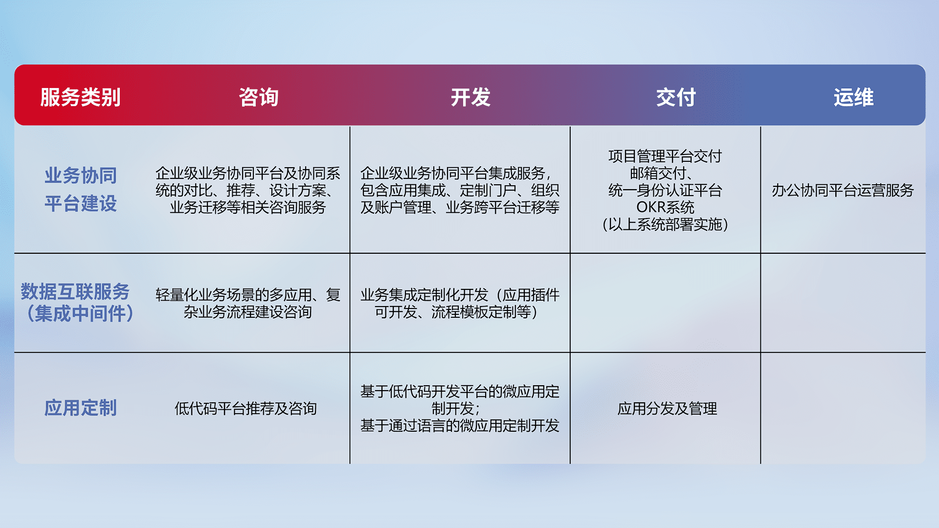 针对钉钉、、企微、、IDaas等平台级产品提供产品的规划、、、方案、、、、交付、、、、定制化开发等服务,,,,实现如统一协同办公、、智能客户服务、、混合会议管理、、智能数据查询、、、等业务场景,,,,实现数字化转型。。